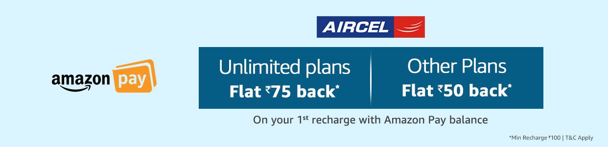 Aircel Flat 75 Offer: Recharge with Aircel Unlimited plans listed on this offer page and get flat Rs. 75 cashback. Offer valid from Nov 07, 2017 to Nov 16, 2017 applicable only on your first recharge using Amazon Pay balance