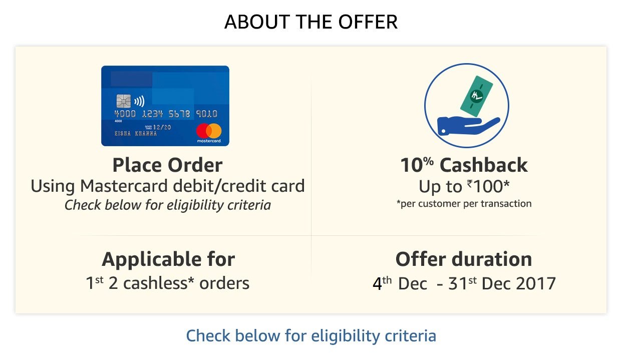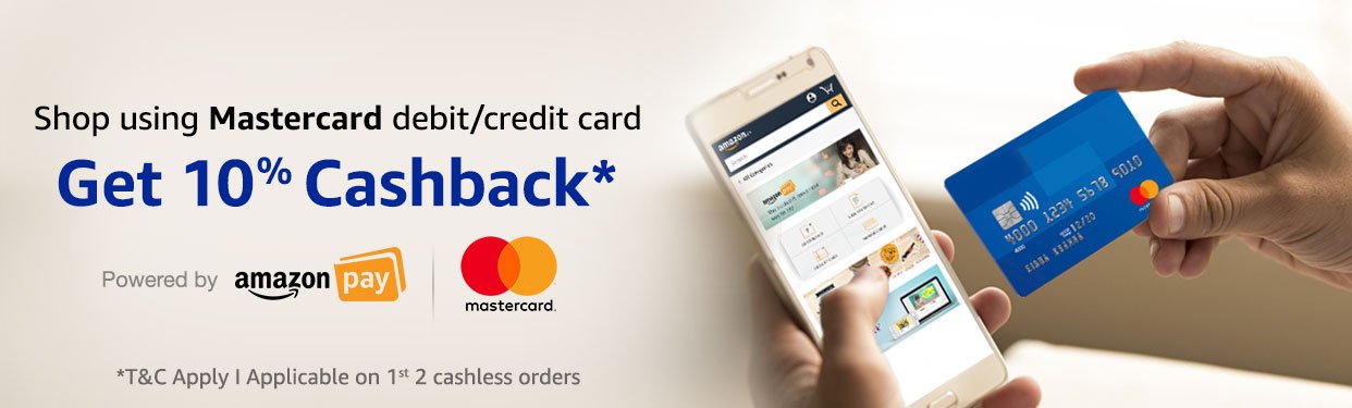 Place your first two cashless orders on www.amazon.in or its mobile application/site thereof (collectively, "Amazon.in") using Mastercard credit/debit card during the Offer Period and get 10% cashback (up to INR 100).